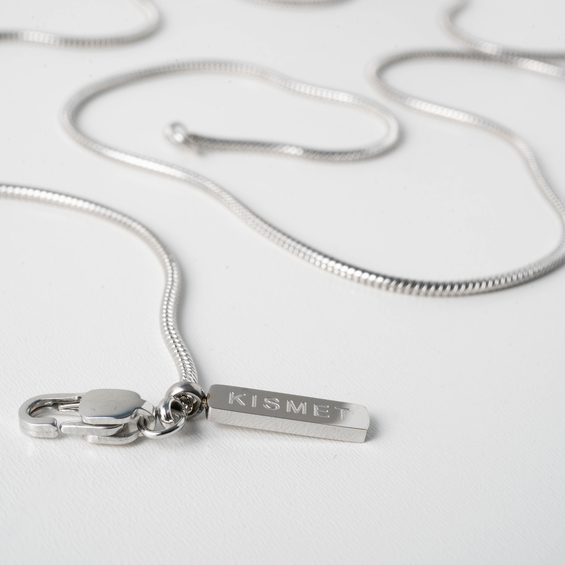 Introducing our silver pendant necklace, a minimalistic piece designed to elevate your look with its simplicity and elegance. The pendant is engraved with “KISMET” and comes attached to a silver stainless steel chain.